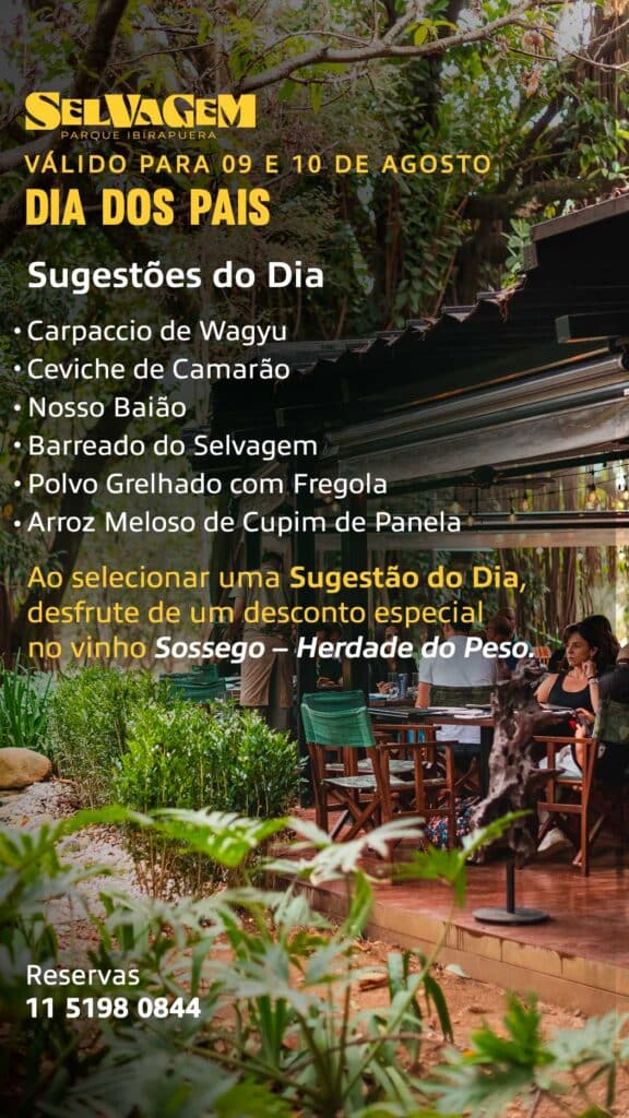 Celebre o Dia dos Pais nos dias 9 e 10 de agosto com uma experiência única em meio à natureza do Parque Ibirapuera. O Selvagem preparou sugestões especiais para a data, convidando você a viver momentos únicos em família, com boa gastronomia em um dos cenários mais encantadores de São Paulo. Ambientes internos e externos com aquecimento garantem o conforto em qualquer temperatura. Faça sua reserva e transforme esta data em uma lembrança inesquecível.